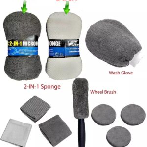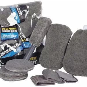 1x Carrying Bag, 1x Wheel Brush, 1x Washing Mitt, 1x Microfiber Drying Cloth, 1x Microfiber Glass Cloth, 1x Microfiber Polishing Cloth, 1x Microfiber Head Sponge, 3x of Applicator Pads